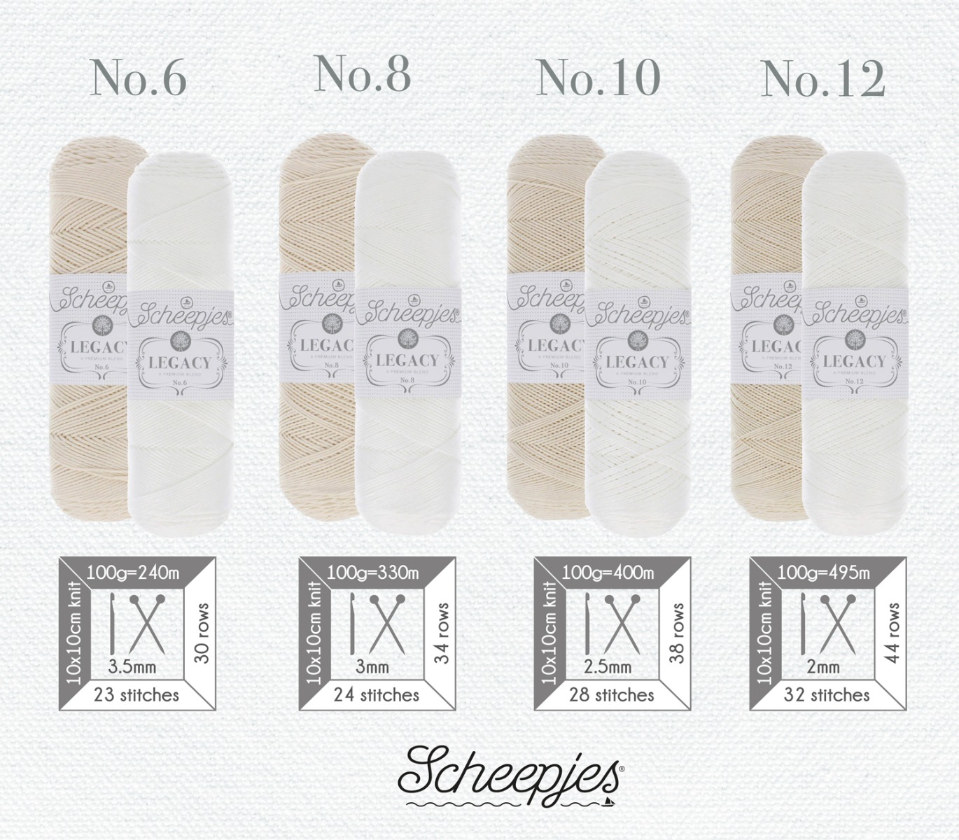 Ab heute ist Scheepjes Legacy erhältlich, aufgeteilt in 2 Sortimente: Scheepjes Legacy Baumwolle x 2 Farben x 4 Stärken x 5 Pull Skeins und Scheepjes Legacy Glanz-Baumwolle x 2 Farben x 4 Stärken x 5 Pull Skeins.