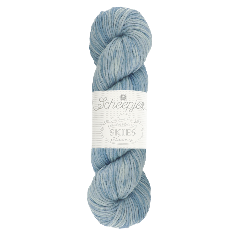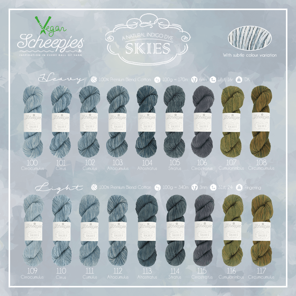 Die neuen Scheepjes Garnqualitäten SKIES bestehen aus vollständig natürlichen Fasern in der Form von 100% Premium Blend-Baumwolle, das so weich wie eine Wolke ist. Die Farben variieren von blassen Blautönen eines sonnigen Tages über ein tiefes traditionelles Indigo bis hin zu wirbelnden Grüntönen eines Himmels während eines Sturms.