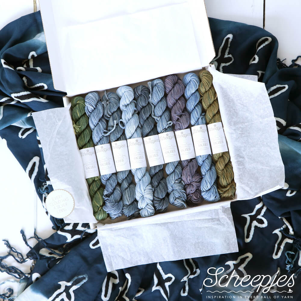 Ab sofort erhältlich: SKIES Sortimentsbox mit 9 Farben x 28g und SKIES 100 Gramm x 9 Farben x 5 Stränge. Ab 9 Mai sind die Varianten von SKIES 100g pro Farbe zu bestellen.