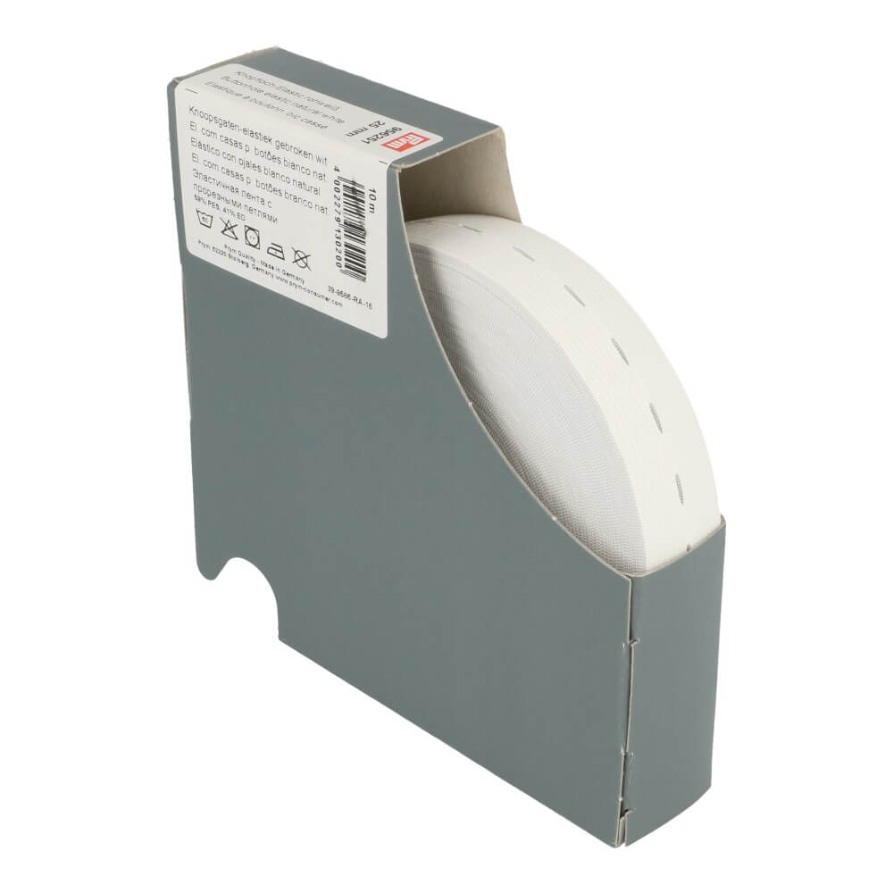 - Prym Knoopsgatenelastiek geweven 25mm - 10mArtikelnummer: 956.2500Dit artikel is momenteel niet in bestelling. Daarom is de leverdatum onbekend.Beschikbaar in 2 varianten