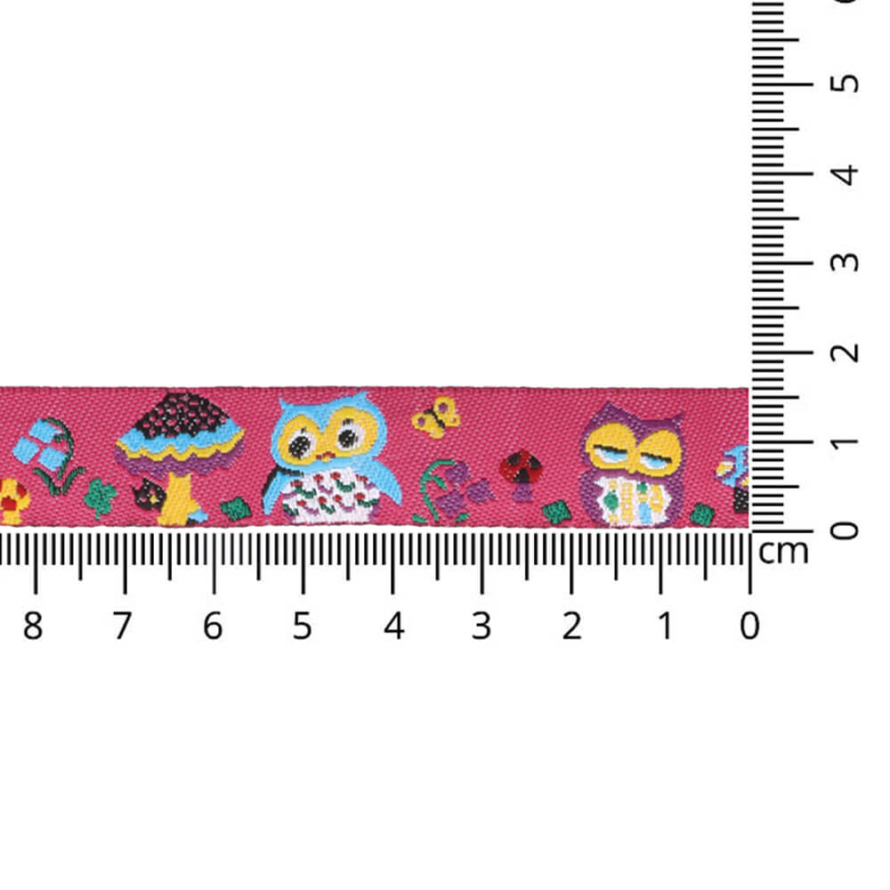 Geweven band uilen en paddenstoelen 16mm - 20m - 02